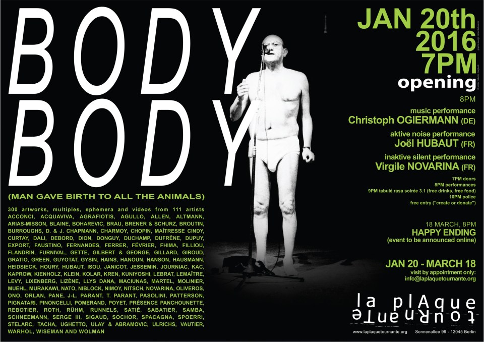 EXPOSITION COLLECTIVE Body body (Man gave birth to all animals) à La plaque tournante du 20 janvier au 18 mars 2016 (Sonneallee 99 – 12045 Berlin). Commissariat de Frédéric Acquaviva.